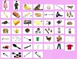 The 46 premium quality photographs are listed below: Boy Girl Bananas Monkey Baseball Bat Dog Bone Bread Butter Bowl Spoon Shoes Socks Mouse Cheese Mailbox Letter Lock Keys Hat Mittens Flowers WateringCan Nuts Bolts Salt Pepper Hammer Nails Shovel Pail Chicken Eggs Needle Thread Hairbrush Comb Glass Pitcher Shirt Pants Paint Paintbrush Toothbrush Toothpaste